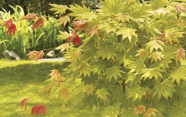 Japanese maples have so much going for them as all-year-round shrubs or trees for the smaller garden. They offer dappled shade from attractive foliage in the summer, striking autumn colour and winter stems. In the spring, most varieties will put on brightly coloured new foliage. There are too many great varieties to name, but one Hillier favourite is Acer shirasawanum ‘Moonrise’, with beautiful pink-tinged new growth maturing to lime green in the summer and butter yellow in the autumn.