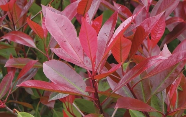 Photinia are evergreen shrubs of medium to large size that typically have tough, mid-to-dark green leaves, although there are also some good variegated varieties now. Photinia responds well to pruning and makes a very good hedging plant – a good alternative to cherry laurel, although it also needs regular trimming to keep it in check.