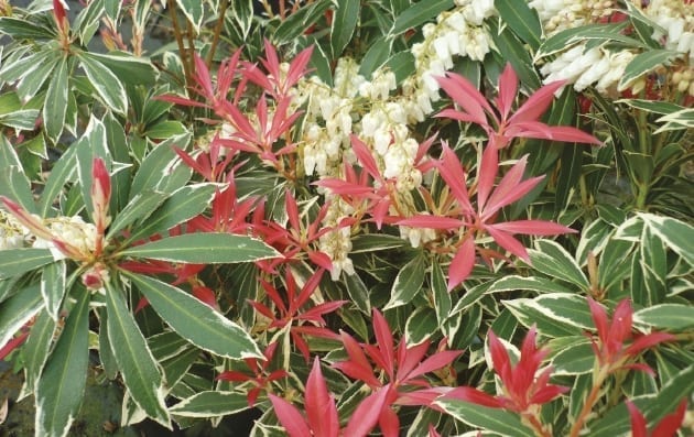 Pieris japonica are Japanese woodland plants that require acidic soil to thrive. They do well in partial shade and are useful to bring colour to an otherwise drab area of the garden.
