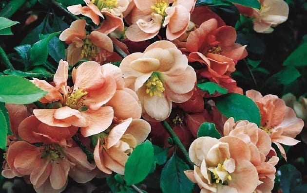 The ornamental quince is a lovely shrub for the border or for training against a wall. It flowers in early spring on bare branches and holds its flowers for a good period of time. Flower colour ranges from white through orange to red and pink and in the autumn, you will have the added bonus of yellow-green fruit. The stems carry sharp spines, so take care when planting or pruning.