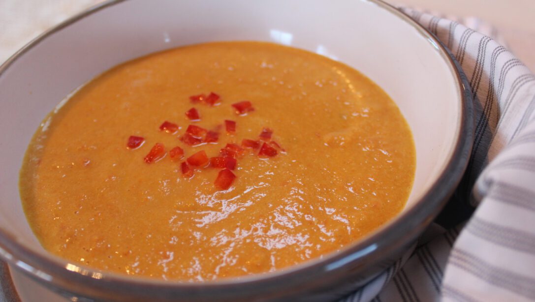 8. Bring back to a simmer to serve. Garnish with finely diced red pepper.