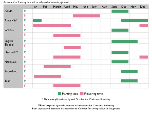 The table below indicates the planting and flowering time of some of the most loved bulb varieties. Flowering time will of course vary based on the climate each year and variety planted.