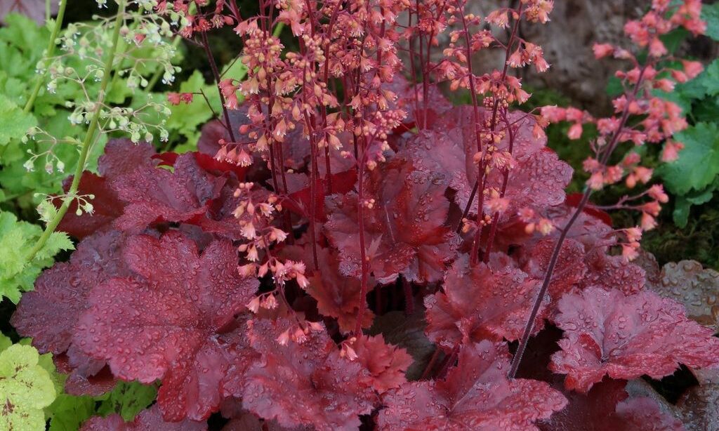 The foliage of ‘Cherry Cola’ makes this Heuchera stand out in the garden. Leaves of red and bronze showcase pretty, vermillion flowers and looks stunning in borders and beds. ‘Cherry Cola’ can also look great on its own as a focal point in a container.