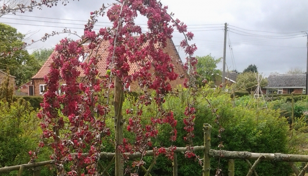 Dr. Warwick, an enthusiastic gardener, contacted Hillier in 2014. He had been growing Malus ‘aldenhamensis’ in his garden and had, 10 years prior, grown some seedlings from its fruits. He had noticed one of these exhibited a weeping habit in clear contrast to the upright form of the parent tree. He contacted Hillier to help establish if this was a unique trait. Hillier identified this was indeed a brand-new variety of Malus, which was given the name Malus x purpurea ‘Crimson Cascade’. Hillier began to propagate using the grafting technique. This has resulted in the commercial production of the new ‘Crimson Cascade’ in time for its launch at Chelsea 2017.