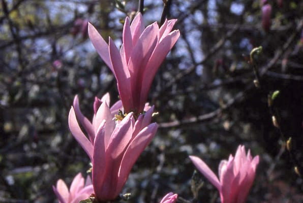 M. Susan is a hardy, upright, deciduous shrub variety of magnolia with large green leaves. Its deep reddish-purple buds open in mid spring to fragrant, cupped flowers with tepals that are red-purple outside and pink within. This is a great plant for a mixed border or as a focal plant.