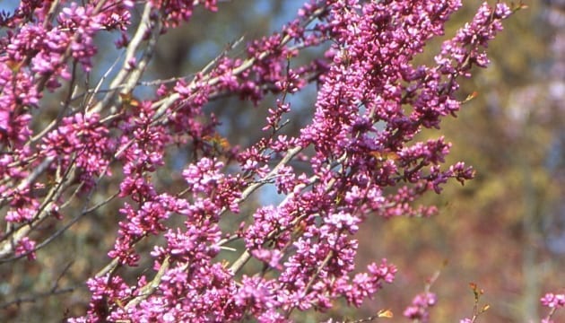 Cercis chinensis ‘Avondale’ is a form of the Chinese redbud that makes a large shrub or small tree. It has masses of purple-pink pea flowers on bare shoots in late March and April. The leaves then unfurl; they are very big, heart-shaped, pale green in colour, and turn yellow in autumn.