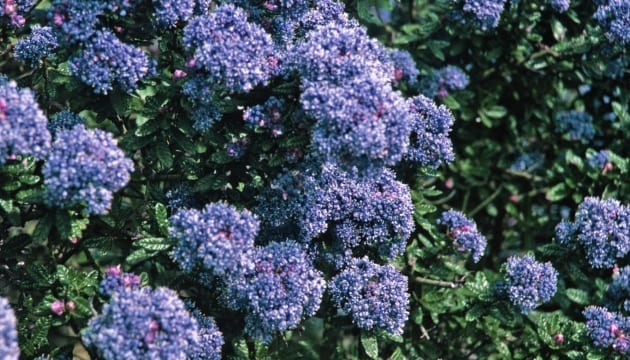 Ceanothus ‘Puget Blue’ is a real stalwart of the garden. This evergreen sets small, dark purple buds in early spring. These often begin to unfold a couple of weeks after Easter, creating dense masses of vibrant powder-blue flower balls that stand in stark contrast to their dark-green, veined leaves. Reduce any new shoots by a third after flowering has finished, feed generously after pruning and apply a mulch.