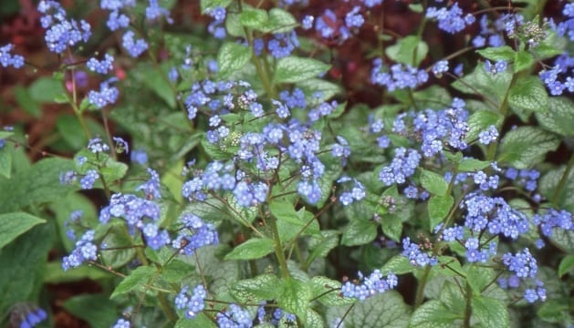 Brunnera are, arguably, the understated heroes of the shady border. They have lovely forget-me-not blue flowers in spring. If you get varieties such as ‘Jack Frost’ or ‘Looking Glass’, the silver leaves look tropical in a woodland border. They, like Pulmonaria, prefer shady woodland settings where their leaves will not scorch in the sun. They pair well with Pulmonarias and Hardy Geraniums in the garden.