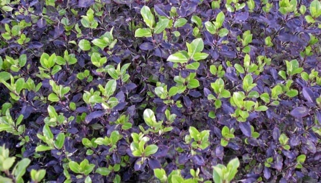Pittosporum tenuifolium ‘Tom Thumb’ is an unsung hero. It produces lovely dark-red leaves throughout the year. These turn green at the tips then change to dark red as the leaves mature, meaning the plant is always changing colour. This is a good plant to bring out the beauty of other coloured plants.