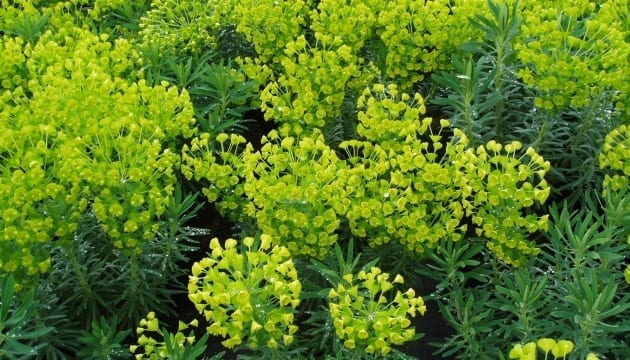 Euphorbia wulfenii is a fantastic, tall plant. This unusual, architectural, evergreen shrub grows to 1.5m with big spikes of lime green flowers. It is great to brighten a hard-to-fill, shady spot. It looks lovely planted in combination with Brunnera, with their little blue flowers; Bergenia ‘Overture’ and Polypodium ferns. Euphorbias can be irritating because their sap is quite potent.