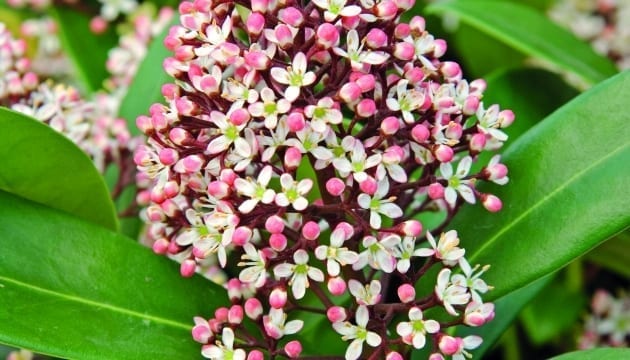 Skimmia japonica ‘Rubella’ is an amazing evergreen mound. With its deep green foliage and dazzling red flower buds throughout the winter, it looks great all year. The buds open in early spring to reveal the sweetest of fragrances from its white flowers. This is a must for any planted container, either mono-planted or as a centrepiece within a mixed bedding arrangement. Planting it in direct sunlight will cause the leaves to turn yellowish green.