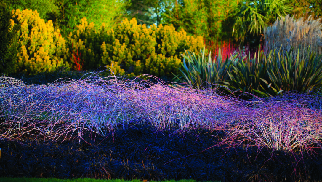 The striking combination of Ophiopogon planiscapus ‘Nigrescens’ and Rubus cockburnianus at the world famous Winter Garden at Sir Harold Hillier Gardens. Photo credit: Matt Pringle for Sir Harold Hillier Gardens