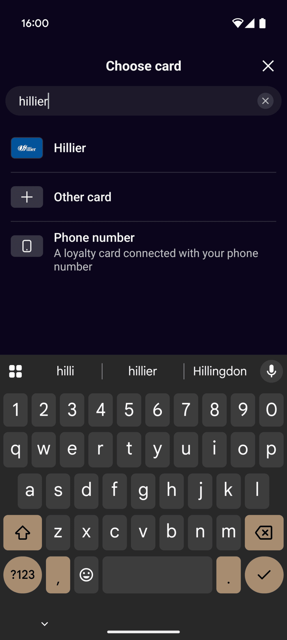 In the search bar, type ‘Hillier’. If it appears in the list, select it. If not, choose ‘Other Card’ or ‘Add Card Manually’.