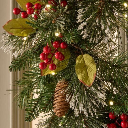 The BOSK Frosted Pine 24" Christmas Wreath adds a welcoming festive touch to any door, wall, or fireplace. With lifelike pine foliage dusted in a delicate frosted finish and 50 warm white LEDs woven throughout, it creates a cosy glow that feels magical day or night. Battery operated for easy placement without trailing cables, this wreath brings instant seasonal charm to your home year after year.