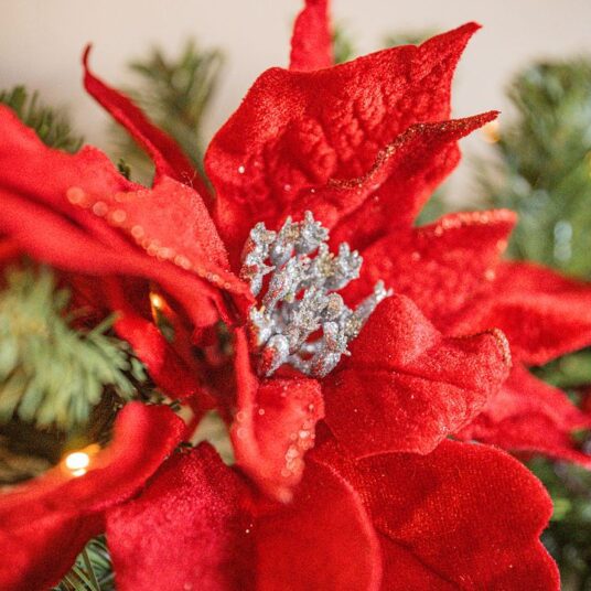 BOSK Poinsettia Pine 26″ Christmas Wreath With 50 Warm White Lights