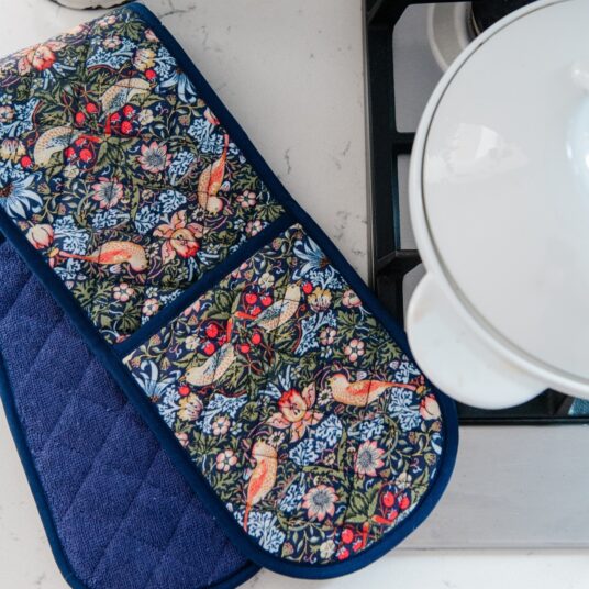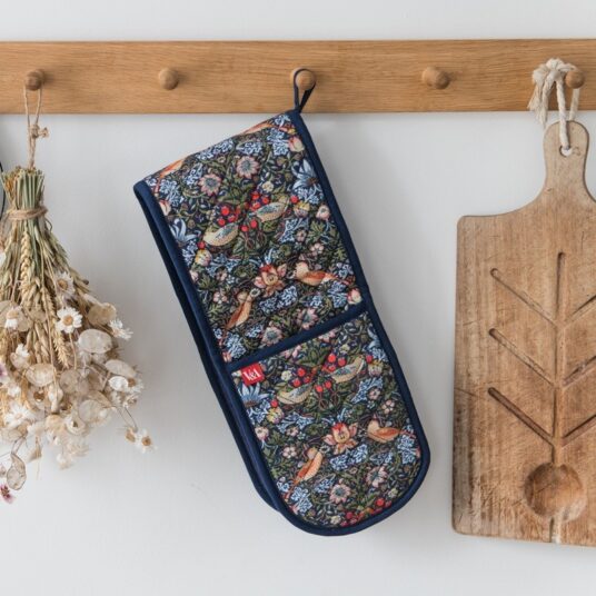Bring a touch of timeless British design to your kitchen with the V&A William Morris Strawberry Thief Double Oven Gloves. Featuring one of Morris’s most beloved patterns, first created in 1883 and inspired by thrushes stealing fruit from his Oxfordshire garden at Kelmscott Manor, these gloves blend heritage charm with modern practicality. Crafted from soft, durable organic cotton, they are GOTS certified and machine washable, making them a sustainable and stylish choice for everyday cooking and baking.