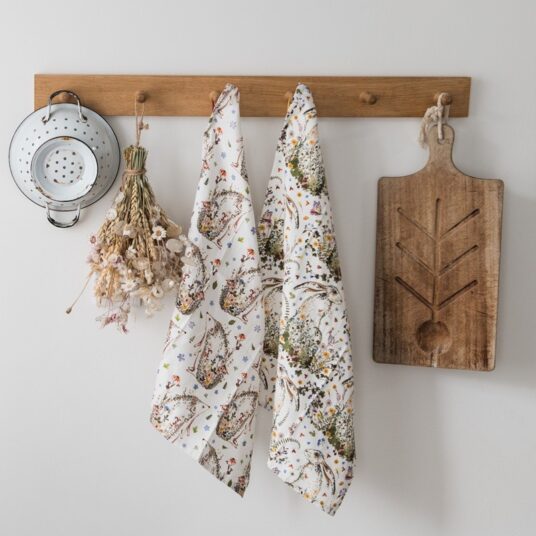 Add a touch of countryside charm to your kitchen with the Wild Press Hare & Hedgehog Tea Towel Set. Designed by Helen Ahpornsiri, this delightful duo features two separate nature-inspired prints — a graceful hare and a curious hedgehog surrounded by colourful wildflowers. Crafted from high-quality organic cotton, they are both soft and durable, perfect for everyday use. Each tea towel includes a handy hanging hoop for easy display and storage. A matching pair of double oven gloves is also available in the hare design for a coordinated look.
