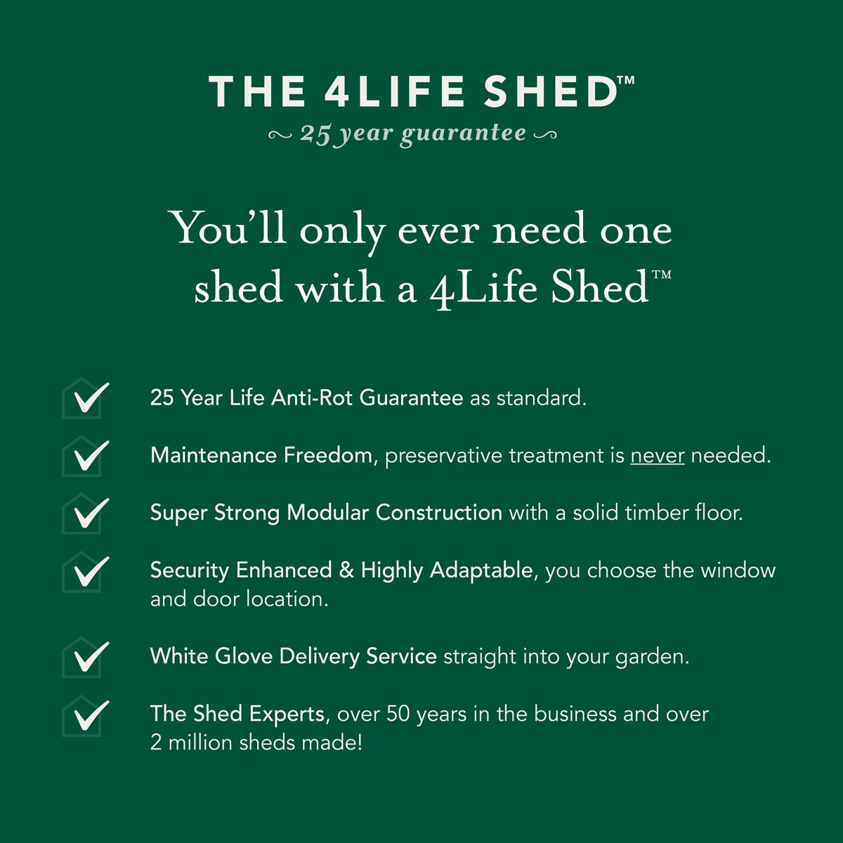 Built to last, this shed features fully modular panels for easier handling during delivery and assembly, while also providing a more robust structure. Pressure-treated timber ensures long-term durability and carries an impressive 25-year anti-rot guarantee, with no need for annual preservative treatments. A solid timber floor supports heavier items with ease and the sturdy roof, finished with green mineral felt, offers reliable protection against the elements. With a double-Z door frame, hidden hinges, and a hasp and staple latch ready for your own padlock, security is well considered. FSC® certified and handcrafted in the UK, it’s delivered using Forest Garden’s White Glove Service, meaning it’s placed exactly where you want it and all packaging is taken away.