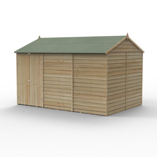 The Forest Garden 4LIFE 12x8ft Reverse Apex Shed with Double Doors and No Windows combines dependable British craftsmanship with a strong, modern design built to last. Handcrafted in the UK using FSC® certified timber, this spacious shed offers secure, clutter-free storage and makes an excellent workshop thanks to its generous headroom and wide double doors. Its improved fully modular construction is delivered in smaller, stronger sections, providing easier assembly, flexible configuration and greater overall stability. As part of the premium 4LIFE range, this shed offers unbeatable longevity and performance among overlap sheds.