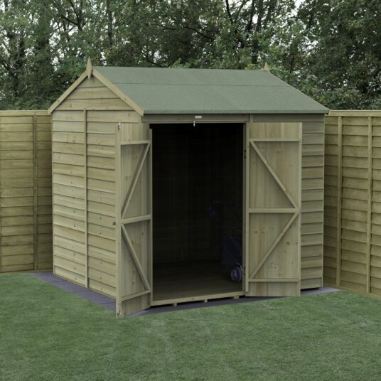 Constructed with straight-cut, pressure-treated overlap boards and supported by 30% thicker framing, the 4LIFE Shed offers excellent durability and improved weather resistance. The pressure treatment delivers a 25-year anti-rot guarantee with absolutely no need for annual preservative treatments—this is the only shed you’ll ever need. A solid timber floor provides strength for storing heavier items, while the 8mm solid sheet roof is finished with green mineral felt for reliable weather protection. Double-Z framed doors, hidden hinges, and a hasp and staple latch (padlock not included) add security, and the traditional apex roof with smooth-planed bargeboards gives a classic finish. Delivered via Forest Garden’s White Glove Delivery Service and fully installed by their expert fitting team, the shed is placed exactly where you want it with all packaging removed for complete convenience.