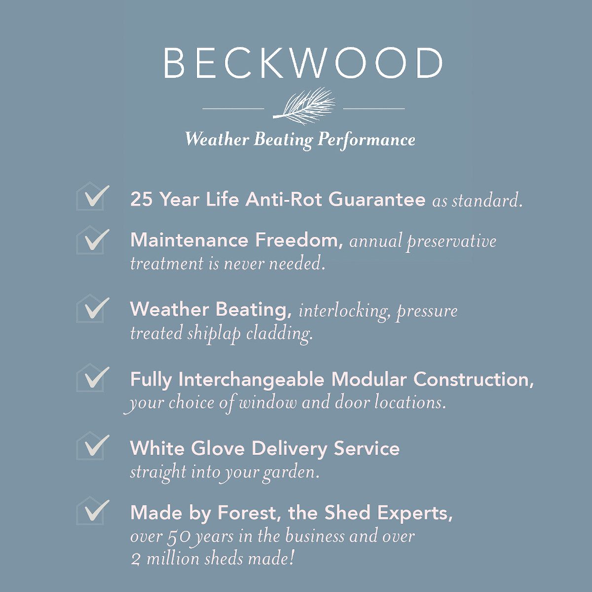 Designed with practicality in mind, the Beckwood features a fully modular design with interchangeable panels, allowing for easy future modifications. The double door, reinforced with a double-Z frame and heavy-duty pad bolt, keeps your belongings safe and secure. Plus, with its pressure-treated timber and 25-year anti-rot guarantee, this shed requires no annual maintenance – unlike most other wooden sheds.