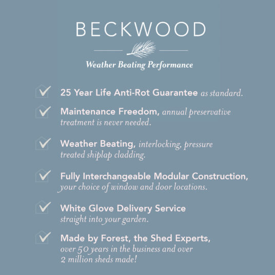 Security and longevity are at the heart of the Beckwood design, featuring double-Z framed doors, hidden hinges, and a pad-bolt locking system. The eight acrylic-glazed windows allow plenty of natural light in while being safer and more durable than glass. Delivered via Forest Garden’s White Glove Delivery Service, the shed arrives ready for straightforward self-assembly, with all packaging removed for your convenience.