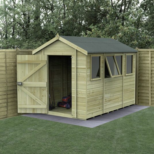 The Forest Garden Timberdale 10x6ft Apex Garden Shed offers generous space and a premium finish, making it ideal for storing tools, equipment, and gardening essentials. With room for a workbench and shelving, it’s also perfect for those wanting a practical workshop at home. Built from high-quality timber with four windows that let in plenty of natural light, this shed provides a bright, sturdy, and reliable space for everyday use.