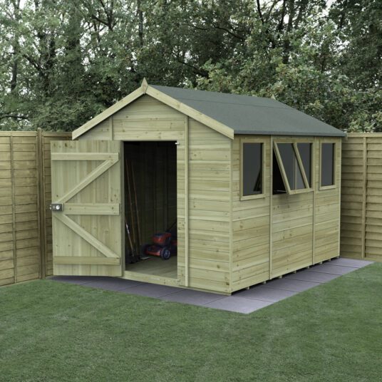 The Forest Garden Timberdale 10x8ft Apex Garden Shed is a premium workshop-style space built for serious garden projects and reliable storage. With generous internal room, it’s ideal for setting up a workbench, chair, and shelving, while still leaving space for larger tools and equipment. Four windows and double window panels allow plenty of natural light inside, creating a bright and practical workspace.