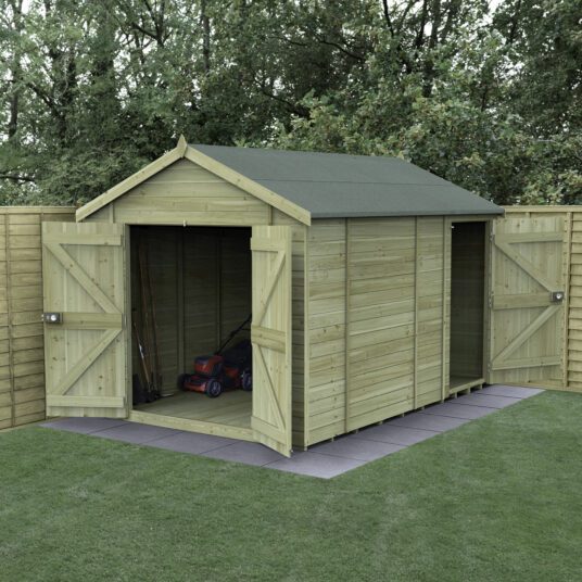 The Forest Garden Timberdale 12x8ft Apex Garden Shed (No Window – Combo, Installed) is a spacious, high-quality workshop designed for those who need serious storage and working space. With its generous dimensions and thoughtful layout, it’s ideal for use as a workshop, hobby room, or large storage shed. The double doors provide easy access for larger equipment, while the additional side door offers convenient entry and exit when the main doors are in use.