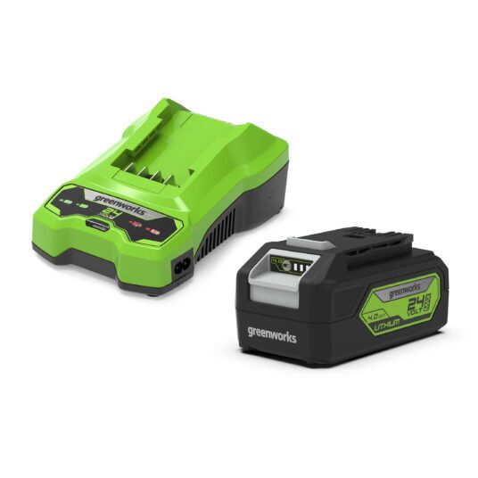 The Greenworks GSK24B4 24V 4Ah kit features a 24V 4Ah battery (G24B4) and fast charger (G24C). Compatible with all 24V Greenworks garden and power tools.