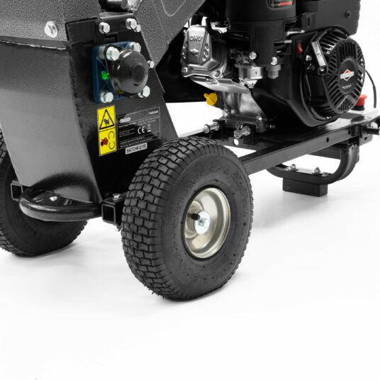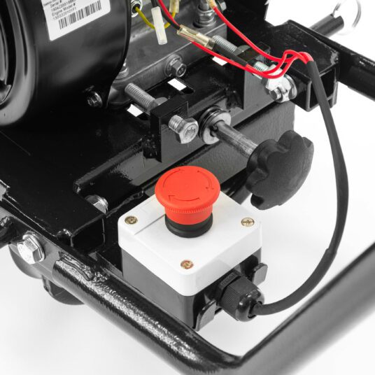 It sits on widely-spaced pneumatic tyres, so it will remain solidly stable during operation; and it benefits from an emergency-stop switch for peace-of-mind when it comes to user-safety.