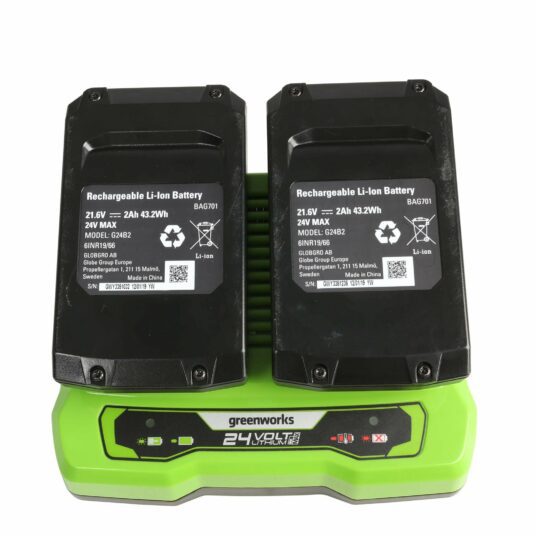 - Includes two 24V batteries and universal charger (battery run times may vary depending on usage)