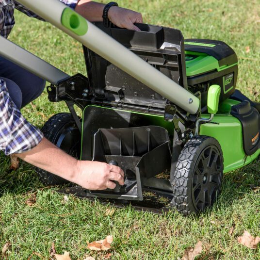 When the mowing is finished, the GreenWorks Pro GD60LM51SPK4 has a vertical storage position which uses up to 70 per cent less space in your shed. This feature also gives easy access to the cutter deck for cleaning.