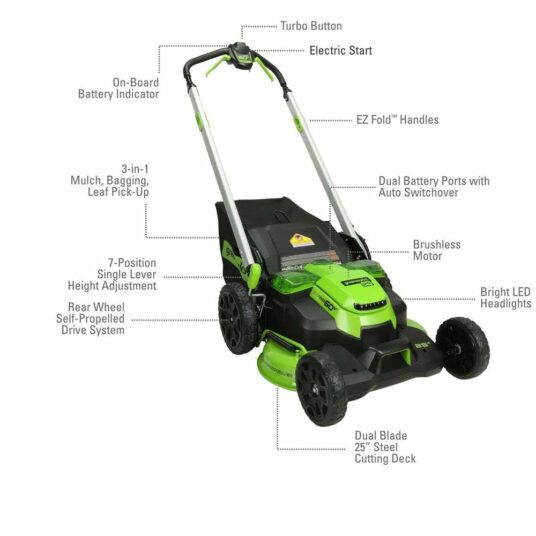 The GreenWorks Pro GD60LM61K4X lawn mower employs a powerful 60 volt lithium-ion battery and high efficiency brushless motor which provides more power, torque, quiet operation and longer motor life. The push start motor provides quick and effortless start-ups and eliminates the hassle of recoil starts. The dual battery slots allow two batteries to be mounted at once, offering extended runtimes without stopping.