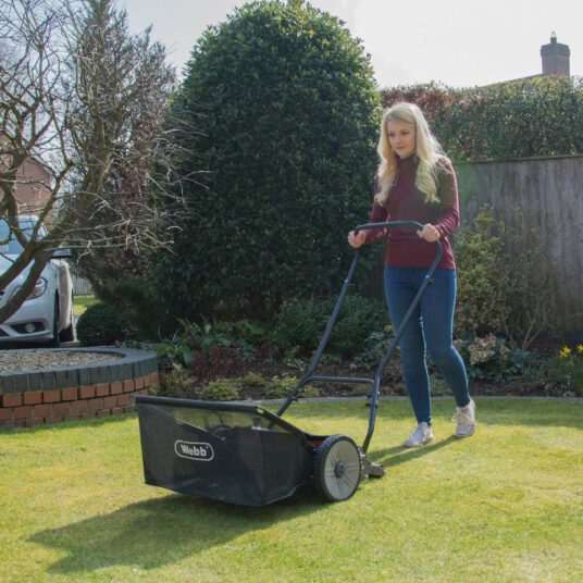 With no cable to hold you back, no noisy engine to disturb your neighbours and a widest-in-class 46cm cut, this traditional hand-push cylinder-mower from Webb is the ideal choice for those maintaining a large lawn in a built-up residential area. Its contactless blade design reduces wear for stay-sharp durability; while its rear-roller will furnish your lawn with an attractive striped finish. The Webb WEH18 comes with a roomy grass-collector and weighs a mere 21kg.]