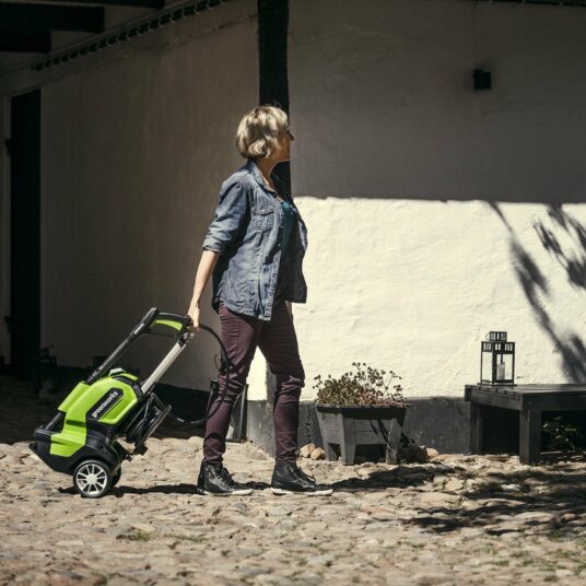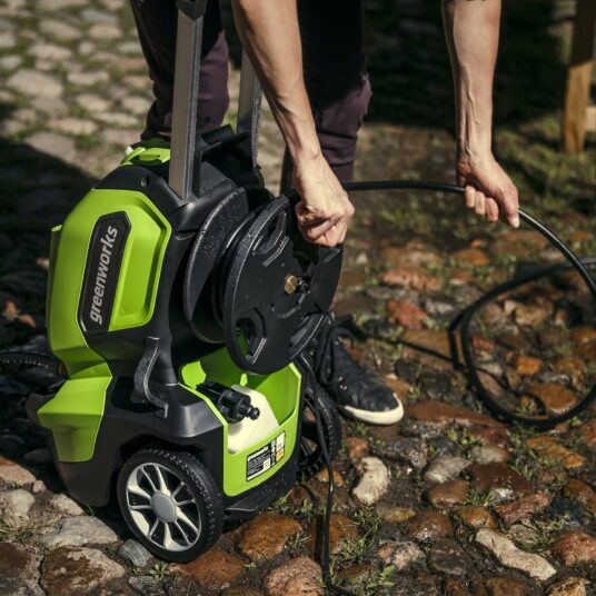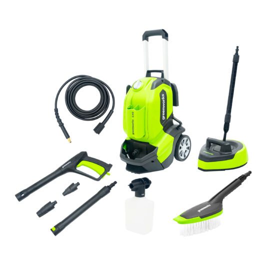 With the integrated handle & transport wheels it is easy to move this machine from location to location. The Greenworks G40 is supplied with vario and foam sprayer nozzles, a 6 metre hose and 5 metre cable. The Home & Garden variant also includes the added benefit of a 12″ Patio Cleaner and Wash Brush, included in the package. The G40 delivers up to 135 bar max pressure at a flow rate of 420 litres per hour.