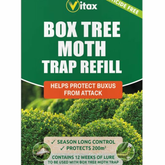 Box Tree Moth Trap Refill, contains 2 lures. Vitax Box Tree Moth Trap consists of a trap with 2 pheromone lures to attract the male box tree moths, monitoring and helping control this serious pest. The lure attracts male moths which then drop through the funnel into the trap. Minor infestations may be adequately controlled by preventing males from mating with female moths. For severe infestations the monitoring trap provides warning of infestation allowing timely control measures to be introduced. The box tree moth is generally active from mid-April to October, peaking between mid-July to the end of September.