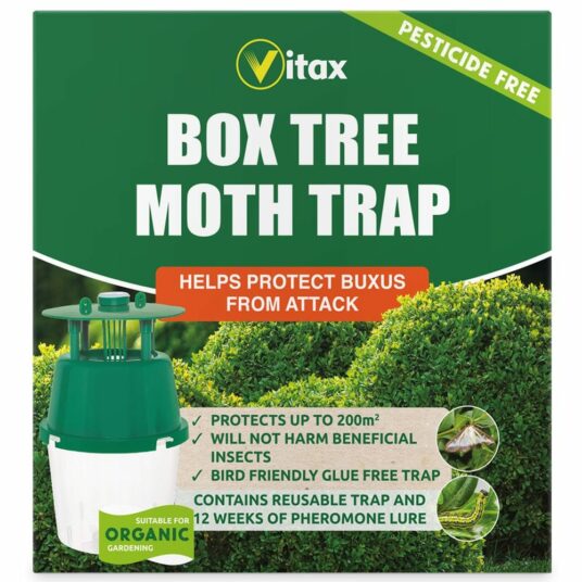 Vitax Box Tree Moth Trap consists of a trap with 2 pheromone lures to attract the male box tree moths, monitoring and helping control this serious pest. The lure attracts male moths which then drop through the funnel into the trap. Minor infestations may be adequately controlled by preventing males from mating with female moths. For severe infestations the monitoring trap provides warning of infestation allowing timely control measures to be introduced. The box tree moth is generally active from mid-April to October, peaking between mid-July to the end of September.