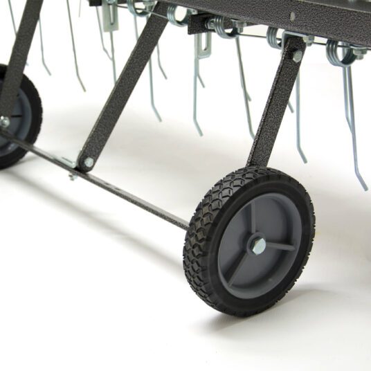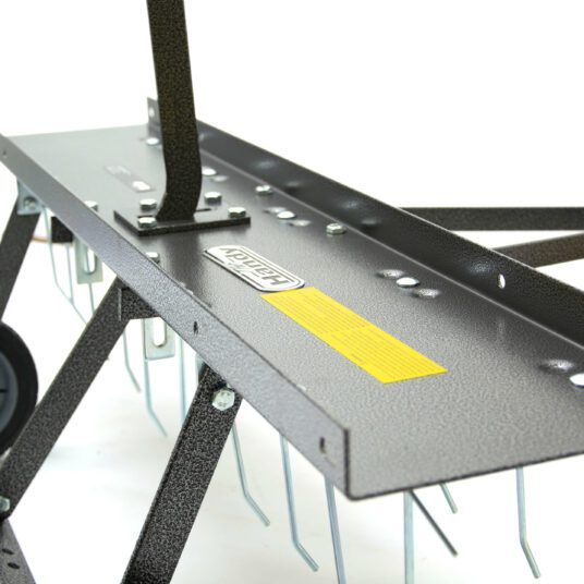 Designed to revitalise the turf, its ten 100mm sprung-loaded metal prongs penetrate down to soil-level, removing any moss, thatch or lateral rhizome build-up that might be inhibiting grass-growth, in turn enabling your lawn to once again flourish and thrive.It’s equipped with a weight tray, so it can be ballasted should you require deeper soil-penetration; and it combines a transport handle with large-wheels and a lightweight design (14.8kg) for simple movement when not hooked-up.