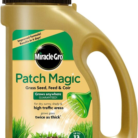 Miracle-Gro Patch Magic Grass Seed, Feed & Coir contains a special binder that helps keep seed from washing away. It grows 2 times thicker than ordinary grass seed and the first shoots can be seen within just 4 days.