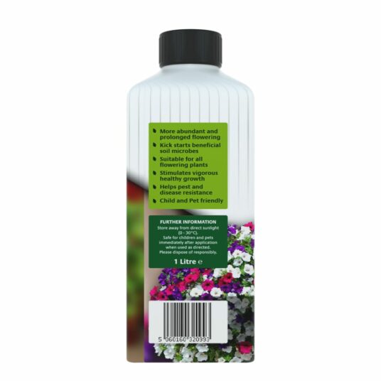 Seaweed extract and amino acid liquid feed formulated for flowers in pots and hanging baskets. Stimulates plant growth and soil biology. Concentrate will make up to 200 litres. Improves and prolongs flowering.