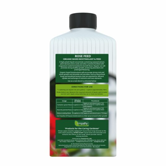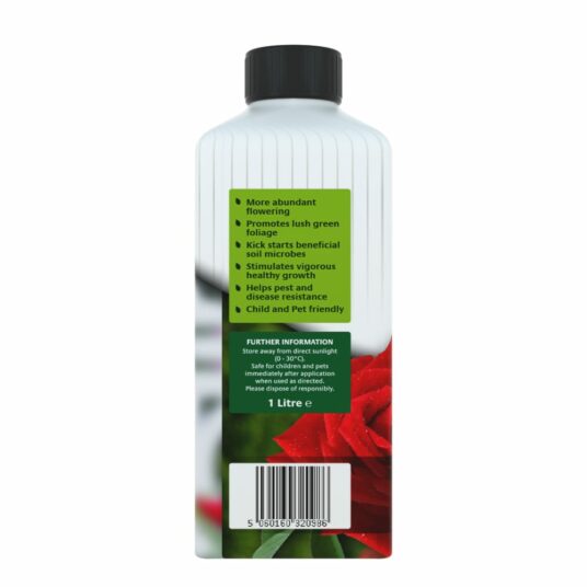 Seaweed extract and amino acid liquid feed formulated for Roses. Stimulates plant growth and soil biology. Concentrate will make up to 200 litres. Improves and prolongs flowering.