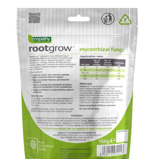 Empathy Rootgrow Mycorrhizal Fungi 150g is a natural soil booster endorsed by the RHS, designed to enhance your plants’ growth by improving nutrient and water uptake. This powerful fungal inoculant forms a symbiotic relationship with plant roots, creating an efficient secondary root system that helps your flowering plants, trees, shrubs, and edibles thrive. Completely natural and plant-friendly, Rootgrow supports healthier, stronger plants throughout their lifetime with just a single application.