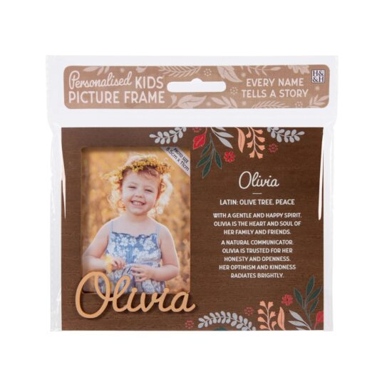 Stylish wooden laminate frame to display your favourite photo. Each frame features the personalised derivation of your child's name alongside a fun personality profile for their name. In a contemporary design style and dark or light coloured wood laminate to suit all home decor, the frame is easy to hang or display and makes the ultimate personalised gift.