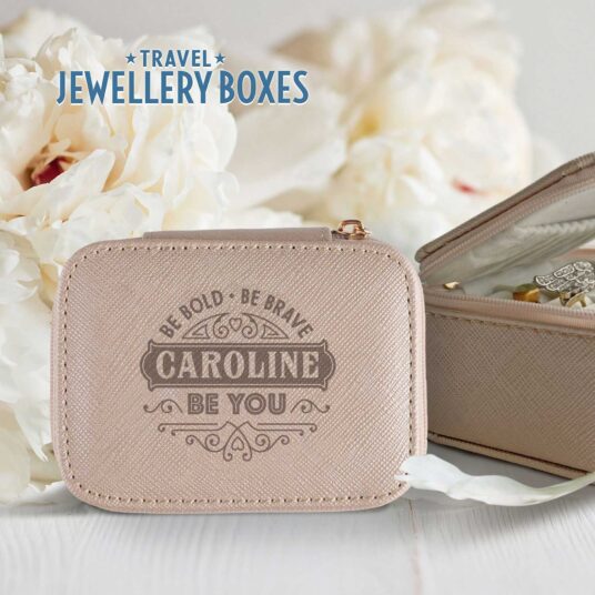 Now you can travel in style knowing that your jewellery is safe and secure. This lightweight, portable and stylish personalised travel jewellery box features heat pressed personalisation alongside uplifting and inspirational sentiments. Compact and elegantly designed, the travel jewellery box contains a handy pocket, cushions and compartments to keep rings safe and necklaces tangle free and neatly stored when you're on the go! in a selection of subtle metallic colours with contrasting gold zipper. A thoughtful gift idea and ideal for holidays, weekends away and business trips.