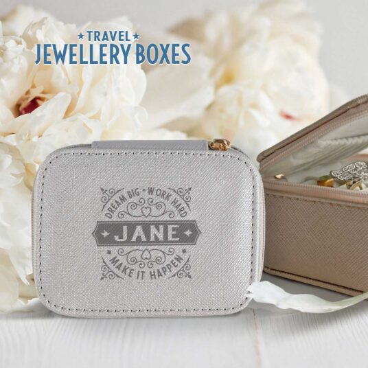 Now you can travel in style knowing that your jewellery is safe and secure. This lightweight, portable and stylish personalised travel jewellery box features heat pressed personalisation alongside uplifting and inspirational sentiments. Compact and elegantly designed, the travel jewellery box contains a handy pocket, cushions and compartments to keep rings safe and necklaces tangle free and neatly stored when you're on the go! in a selection of subtle metallic colours with contrasting gold zipper. A thoughtful gift idea and ideal for holidays, weekends away and business trips.