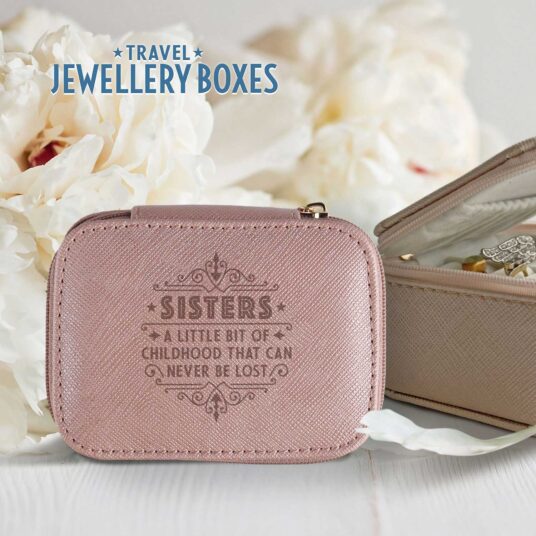 Now you can travel in style knowing that your jewellery is safe and secure. This lightweight, portable and stylish personalised travel jewellery box features heat pressed personalisation alongside uplifting and inspirational sentiments. Compact and elegantly designed, the travel jewellery box contains a handy pocket, cushions and compartments to keep rings safe and necklaces tangle free and neatly stored when you're on the go! in a selection of subtle metallic colours with contrasting gold zipper. A thoughtful gift idea and ideal for holidays, weekends away and business trips.
