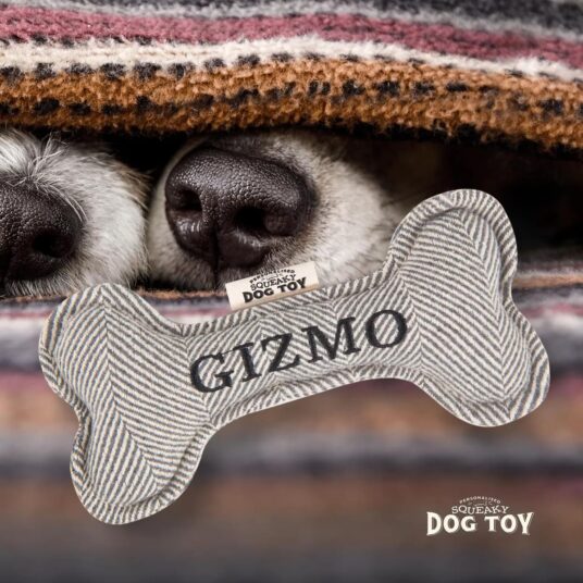 Pre-personalised squeaky dog toy. Durable tweed, popular breeds and names.