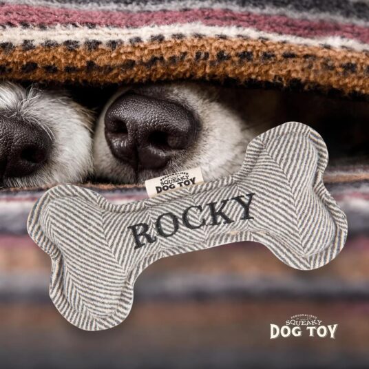 Pre-personalised squeaky dog toy. Durable tweed, popular breeds and names.