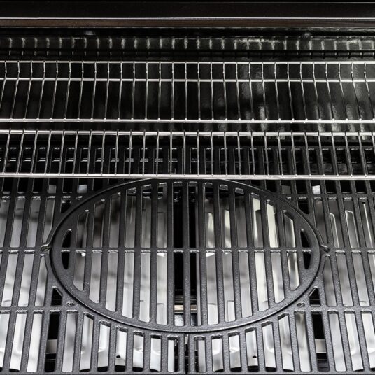 Designed with convenience in mind, it features a recessed side burner for sauces and sides, an extendable warming rack, electronic ignition, and a fold-down front door that doubles as a handy shelf. With high-performance burners, an enamel-coated firebox and hood, and an easy-clean pull-out grease tray, this BBQ makes every garden cook-up smooth, efficient, and enjoyable.
